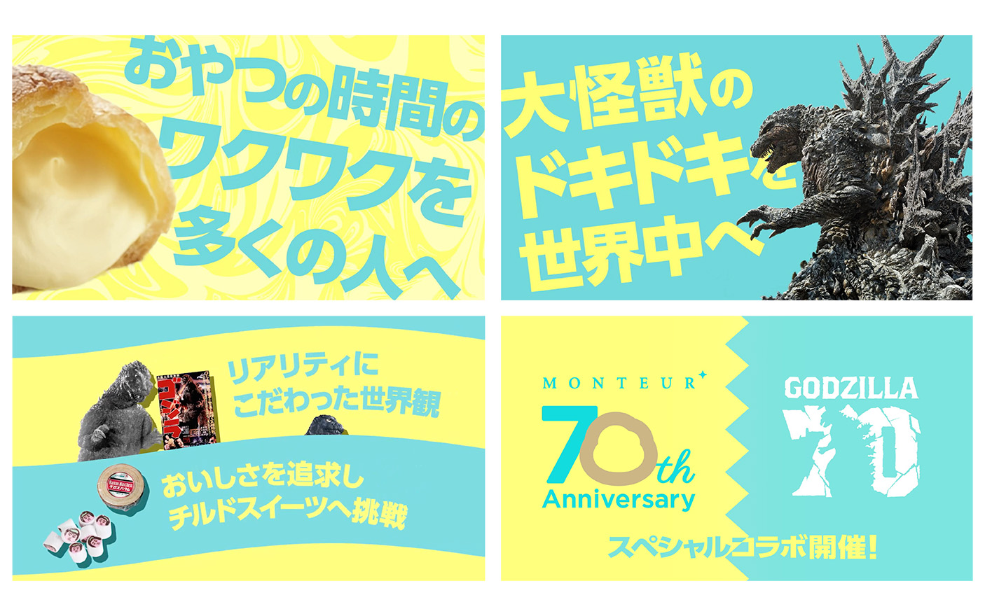 共に70年の歴史を刻んできたモンテールとゴジラの出会いを記念して、コラボ施策のスタートを華々しく伝えると共に、両者の歴史や貴重なアーカイブ写真を使用した2本の動画を制作した。