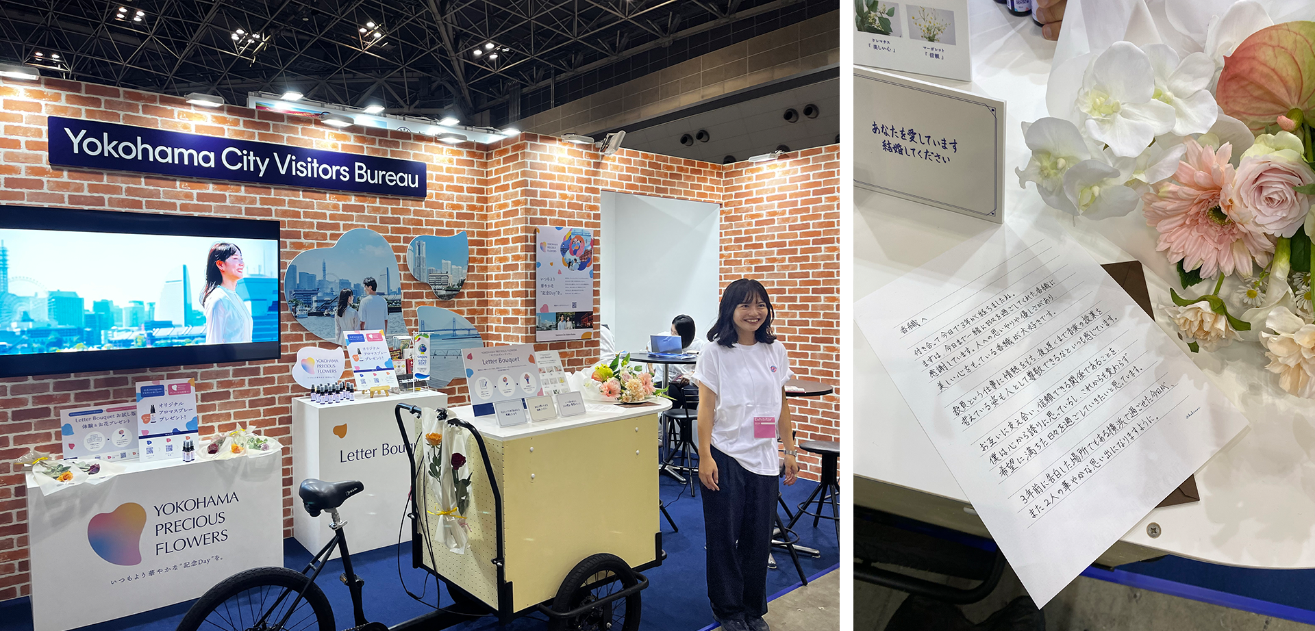 「ツーリズムEXPOジャパン」に出展するブースの企画と運用を担当。横浜での記念日を疑似体験してもらえるような空間を目指し、壁面は横浜をイメージさせる赤レンガ仕様にした。ブース内のところどころに花の演出をもたらすことで華やかさも演出。また、アロマスプレーのプレゼントや、「Letter Bouquet」の簡易体験なども用意。期間中は多数の来場者で賑わい、本プロジェクトの趣旨を発信することができた。